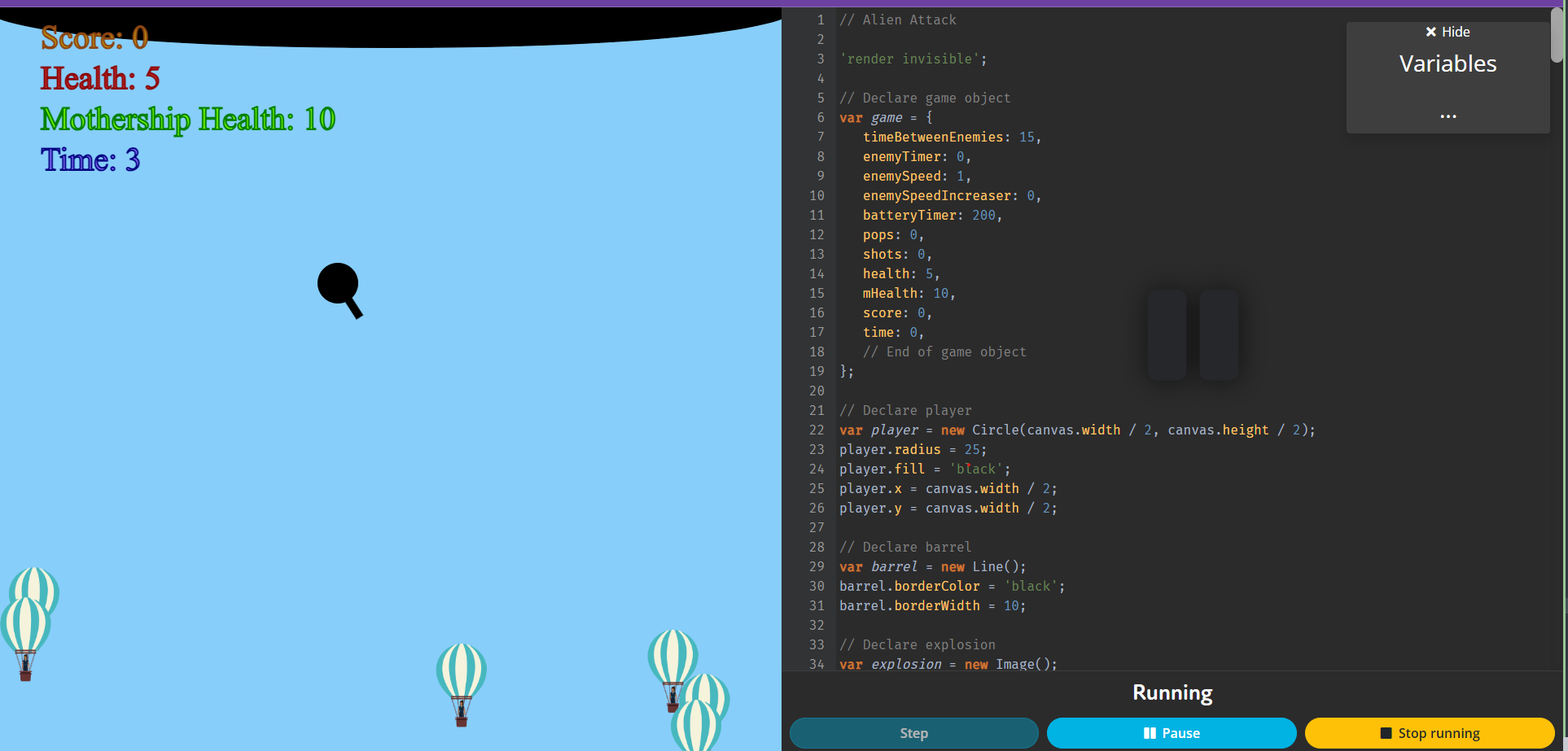 Use the mouse to move your ship (the black circle). Use A and D to rotate the barrel of your laser gun, and click the mouse to shoot. The government has sent explosively hot air balloons to destroy your mothership. Shoot the balloons before they reach the mothership, and don't let them touch you. When either you or the mothership runs out of health, you die. You must try and get the highest possible score before then. Score is increased by destroying enemies and by staying alive. Hitting multiple enemies in one shot is better. Score is decreased by losing health, the mothership losing health, and missing shots. When you shoot a battery, the mothership gets enough power to send down a beam which pushes down balloons.